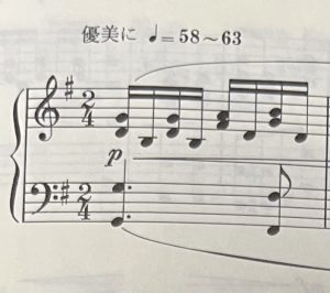 3番の “おぼろ月” のところには p と書いてあるはずです。これはピアノと呼ばれる記号で、弱くといった意味があります。