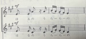 “はるの” の直後にある髪飾りのような記号が16分休符です。実はこれ、存在を忘れられていることが多い。いろいろ聴いてみると、